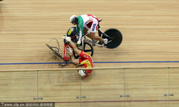 搜狐体育讯 北京时间11月17日,2010年广州亚运会场地自行车赛继续进行,继昨天女子记分赛连环撞车事故之后,在今天下午刚刚的男子凯林赛中又出现撞车意外,中国选手张磊摔倒,好在没事,张磊很快站了起来。不过伊朗选手受伤被送救护车。