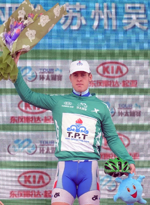 苏州,2011年11月2日 (体育)(7)自行车——2011环太湖国际公路自行车赛移师苏州 11月2日,获得冲刺王的伊朗大布里斯石化洲际车队选手鲍里斯在领奖台上。当日,2011环太湖国际公路自行车赛进入第二赛段从苏州吴中区西山岛至高新区镇湖镇的争夺,全长104.5公里。 新华社记者 陈琪 摄 (责任编辑:五月清风)