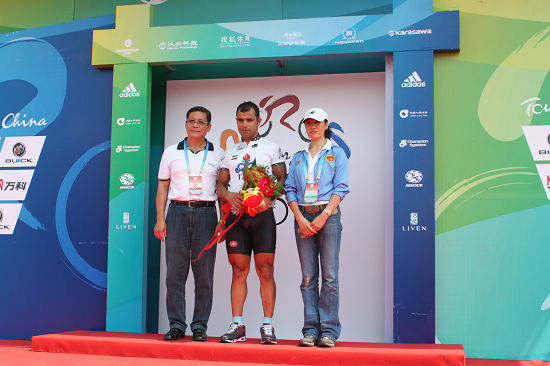 第一赛段中间设有两个爬山积分点和三个冲刺积分点。 比赛伊始,中国香港队、伊朗大布里斯队、马可波罗队、美国队和中国万科队都分别派出队员拉到最前面,对整个形势进行试探,并为各自队友抢分捞钱赢得机会,其中中国香港队的张敬乐、张敬炜在老将黄金宝等队友的压寨配合下,发挥了不俗的状态,并抢得多个积分到手。 第五圈,韩国景山队的新加坡车手文森特因摔车不幸退赛,第七圈,蒙古队车手德勒巴雅尔同样退赛。 从第七圈开始,实力车手开始表现出应有的状态,中国马可波罗队、德国纽特里什队、伊朗大布里斯队和乌克兰队分别强按马头伺机前冲,但是在基本平坦的路面上,效果不大,德国纽特里什队要保住穆勒黄衫的意图,和伊朗大布里斯队奋力抢分的意愿十分明显,而其他队里来了状态的老将新秀皆不甘人后。 在两个爬山积分和三个冲刺积分的争夺里,台湾捷安特队的头号车手麦大卫和中国马可波罗队的大牌明星范伯恩都有出色表现,在时机把握和压住风头方面,让所有年轻人看到差距。 到第八圈,六位车手脱离大集团百余米,但是他们身后多达四位德国纽特里什车手在带头追赶,黄衫保持者穆勒则被掩护的非常结实,终于在离终点一公里处,花开果落,126公里之后跑得好跑得坏的车手迟早都在这一刻还了愿!