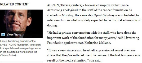阿姆斯特朗曾经在1999至2005年间连续七次获得环法自行车赛总冠军,不过去年美国反兴奋剂机构经过长期调查之后,证实他的冠军都是依靠违禁药物才能获得。美国反兴奋剂机构随即剥夺了其全部环法冠军头衔,并对其处以终身禁赛的处罚。随后国际自行车联盟表示支持美国反兴奋剂机构的决定。 对于这一指控,阿姆斯特朗起初坚称自己是清白的,但是在上个月有外媒曝出消息,阿姆斯特朗正在考虑承认自己服用违禁药物,为的是换取继续参赛的资格。近日这一消息似乎得到了证实,在接受媒体采访时,阿姆斯特朗基金会的发言人卡特莱恩-麦克莱表示:“他(阿姆斯特朗)前不久和反兴奋剂机构有过私下里的接洽,因为无论是他本人还是我们的基金会,都受到了很大的压力,这种感觉十分复杂。阿姆斯特朗本人感到十分后悔,过去几年间他犯了一些错误,吸引到了媒体的关注。” 阿姆斯特朗的道歉计划在美国当地时间本周四的电视节目中播出,这档节目也是他自从被剥夺环法冠军之后的第一次接受媒体采访。这次采访的主持人是美国脱口秀女皇奥普拉-温福利,节目希望能够报道阿姆斯特朗如何在职业生涯偷偷使用禁药。 “阿姆斯特朗会在节目中公开承认自己服用禁药的事实,并且为自己多年来的欺骗行为道歉。无论是撒谎还是现在的道歉,我们都希望能够取得好的成绩,从而延续他的职业生涯。”卡特莱恩-麦克莱说。 对于这件事,三大社也给予了高度关注。美联社在报道中指出,阿姆斯特朗在周一录制的奥普拉脱口秀节目中承认服用违禁药物来赢得环法冠军,节目组中一名不愿意透露个人姓名的工作人员承认了这一消息。据称该节目会在美国当地时间周四播出。 法新社的文章表示,自行车运动员阿姆斯特朗即将在热门节目“奥普拉脱口秀”中承认自己长期服用违禁药物的事实,该次节目将在本周之内举行。虽然奥普拉本人此前没有在个人官方网站或者是节目网站上透露太多关于本次访谈的内容,但是她在自己的个人微博上说明该次访谈的录制时间超过了两个半小时。“他准备好了!”奥普拉在微博中写道。 路透社也报道了该消息,据《今日美国》消息,美国当地时间周一晚上,阿姆斯特朗在录制“奥普拉脱口秀”时承认自己曾经服用过禁药。不过这一言论目前还没有得到阿姆斯特朗本人以及奥普拉的证实。到现在为止,目前为止,阿姆斯特朗的律师以及发言人都没有对这一言论进行回应。而奥普拉本人只是在推特上透露了阿姆斯特朗已经准备好了访谈节目,具体节目内容将在周四播出。此外奥普拉本人也表示她将会在周四现身CBS的电视节目,畅谈关于阿姆斯特朗访谈的消息。