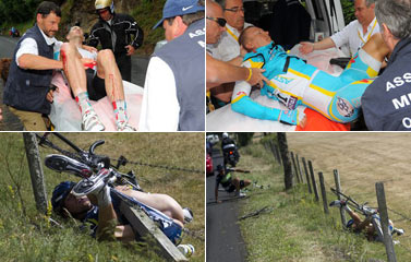 事故、骨折、伤退……,在环法迎来第一个休息日前的第9赛段可谓惨烈!仅仅一个赛段便有9位车手提前告别本次赛事,其中阿斯特纳车队的哈萨克斯坦名将维诺库罗夫更是遭遇重伤,可能危及职业生涯。另外弗莱查和胡格兰德还遭遇环法历史上最糟糕事件,两人被转播机构的轿车撞飞,其中胡格兰德可能需要缝30针。 今年的环法赛事前半段进行的尚算平稳,直到第4赛段才出现了第一位退赛者—范德瓦尔,在本赛段之前总共只有10位车手退赛,但今天算上未到起点签到的西班牙车手加拉特,一天环法大赛便“损失”了8人之多,其中在102公里处向着罗德兹进发的大下坡时,在拐弯处大部队中却出现摔车事故,结果这一摔让四位车手骨折退赛。 当时根据测速,下坡时车手们是以每小时70公里-80公里的速度冲大下坡,结果在一个并不急的弯角处却有多位车手摔倒在地,其中阿斯塔纳车队的主将维诺库罗夫更是摔到了路边沟里的大树旁,而马路上还坐着两位伤员。在队友格里夫科和队医的搀扶下,维诺库罗夫缓慢的走到了路旁,但很明显他伤得不轻,至少右脚不敢触地。 稍后不久,官方宣布在此次事故中范登布罗克肩胛骨骨折、扎布里斯基手腕骨折和威莱姆斯锁骨骨折,所有伤员立即被送往了欧里亚克当地医院,而维诺库罗夫更是肘部、大腿和右股股多处骨折骨裂,由于伤势太过严重维诺库罗夫已经被直升飞机立即送往巴黎医院,接受卡通尼教授的手术。 对于此次事故,安迪-施莱克表示:“这次事故可能就是因为大部队的前部在过弯时滑了一下,看起来就是一次简单的车手失误,但却造成了这么多车手的严重受伤,当他们摔倒时,赛道的右侧全是硬的混凝土路肩。”对于如此严重的事故,一位车迷不解道:“为什么不把自行车运动归类为极限运动呢?” 更令人气愤的是在距离终点36公里左右的位置,处于领骑集团中的西班牙车手弗莱查居然被电视台的一辆轿车撞倒,而荷兰车手胡格兰德更是受牵连飞起来撞到了路边的铁丝围栏上,好在两人只是轻微擦伤并无大碍,正因如此组委会首次在一个赛段中将最佳敢斗奖颁发给了两位车手—弗莱查和胡格兰德。事后因躲避树而撞人的“肇事司机”已经被逐出了环法赛事。 多处擦伤的胡格兰德之后不仅坚持完赛还获得了爬坡王的红白斑点衫,站到领奖台的荷兰人选择了大度对待事故,“我们应该为活着而感到高兴,事故还真是恐怖,我可以责怪别人,但我认为这事不是他们故意的,我认为在车里的人肯定会感到内疚,可以确定他们将向我和弗莱查道歉,其实弗莱查已经和我道歉了,这本不该发生,因为类似的事情总是可能发生的。” “我和弗莱查说‘我们这不还活着么,维兰特因为事故就挂了。’我大概有3处伤口,大概有7厘米长并且很深,我现在就得去医院,我想怎么着至少也得缝30针吧,当时我也没什么感觉,就是翻了几个筋斗,我不知道车从那儿开过来的,等我明白过来,弗莱查已经坐在地上了,我也没什么可做的,摔在围栏后,我看看自己的腿想了想,自行车运动究竟是什么?”(搜狐体育 陶朗加) (责任编辑:柴森森)