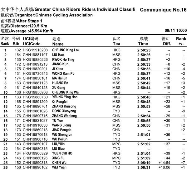 首届环中赛第一赛段 《大中华区团体成绩》公告