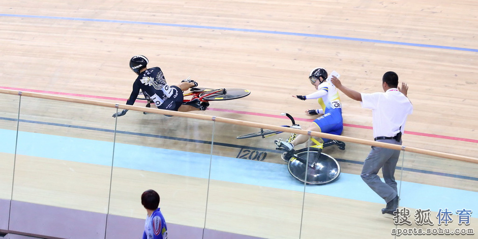 就在两人相互“围猎”对方时,在前几乎静止的郭爽突然失去平衡连人带车摔下斜坡上的赛道,躲闪不及的林俊红也被撞倒。随后,在男子争先赛决赛的第一局中,这一幕再次上演,山东队张淼在僵持中突然从外道斜坡摔下,身后的江苏队包赛飞躲闪不及,车轮直压向对手脖颈后摔倒,张淼幸亏有防护帽才躲过一劫,但衣服撕了个大口子,腿也大面积擦伤。