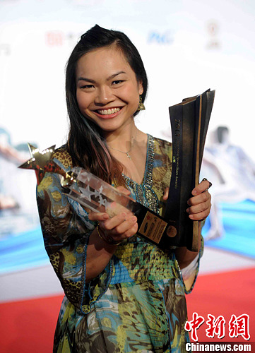 3月13日,来自单车的李慧诗获得“星中之星香港杰出运动员大奖” 及“香港杰出运动员” 两个奖项。当晚, “2013年度香港杰出运动员选举颁奖典礼”在香港会展举行。中新社发 谭达明 摄